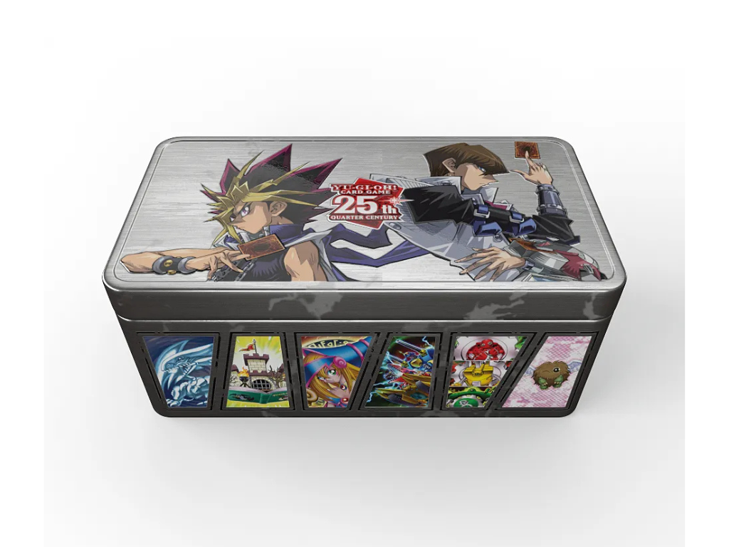 Meanwhile, the 50 Quarter Century Secret Rare cards in the set are a trip down memory lane, showcasing iconic monsters and imagery from decades of Dueling. In addition to the sixteen cards shown on the sides of the tins (and more about those later!), there were just too many famous moments to pass up, so we added 34 more cards to the Quarter Century Secret Rare pool, and you’ll get three in every Tin.